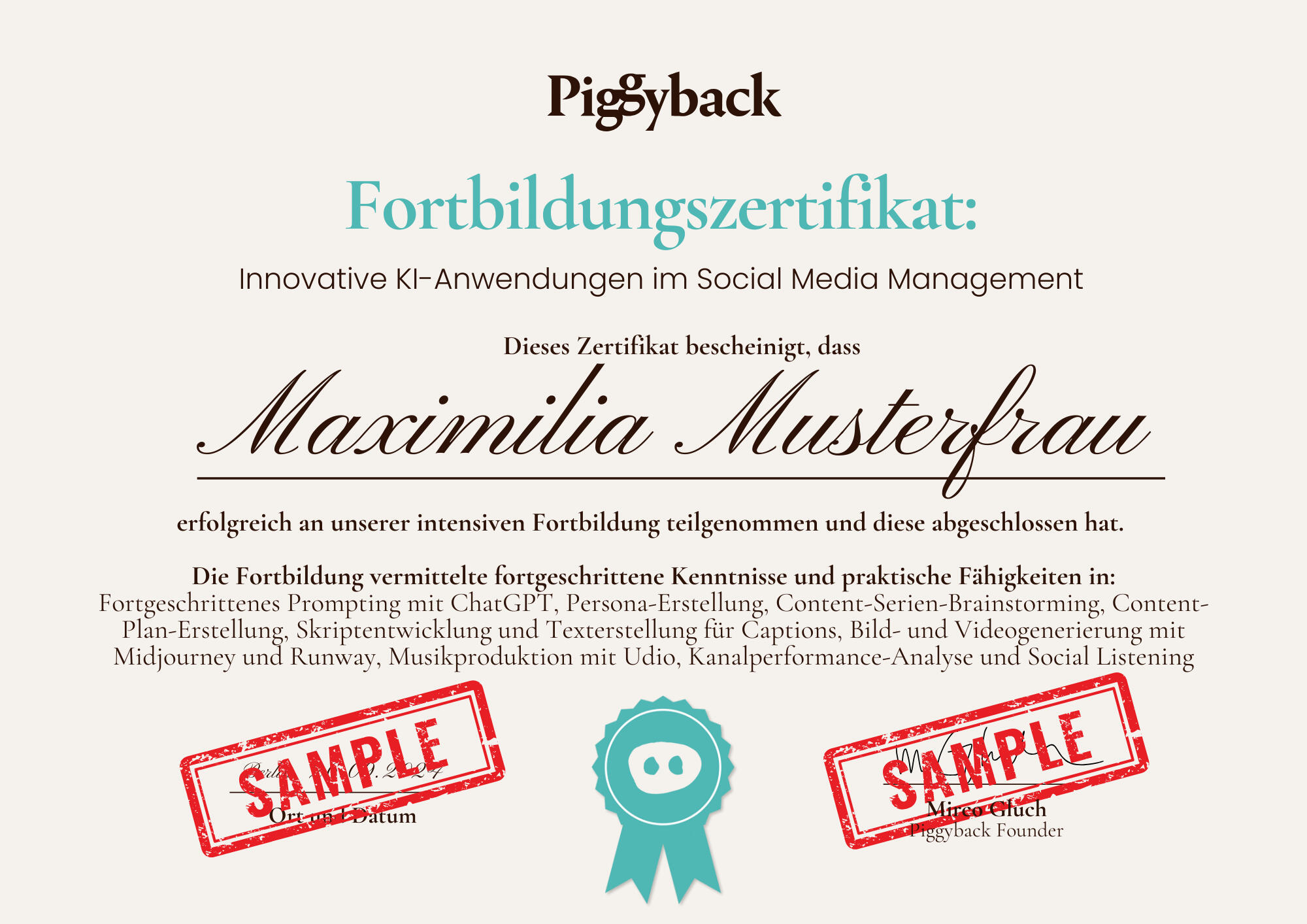 Nach Abschluss des Workshops erhältst du dein offizielles Zertifikat über deine ''neu erworbenen fortgeschrittenen KI-Fähigkeiten** im Social Media Marketing.
